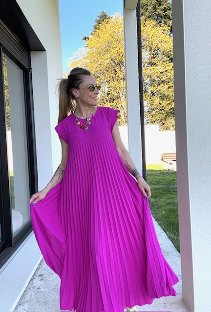 Avec sa coupe longue plissée, elle ondule délicatement à chaque mouvement, créant un effet vaporeux et raffiné, comme un souffle d’air sur la peau.