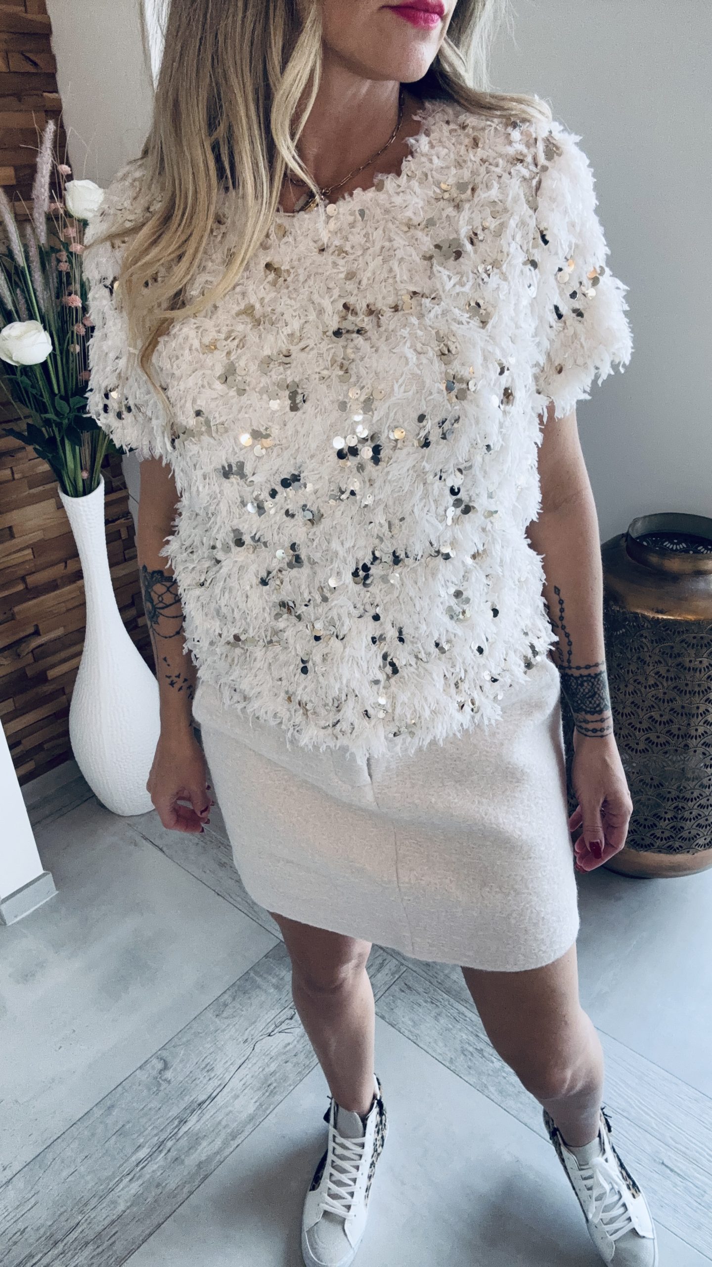 Laissez-vous séduire par ce top chic et audacieux au design effet plume. Sa teinte beige subtilement rehaussée de paillettes et de sequins apporte une touche glamour à votre tenue. Léger et éclatant, il est idéal pour briller lors de vos soirées ou événements spéciaux.